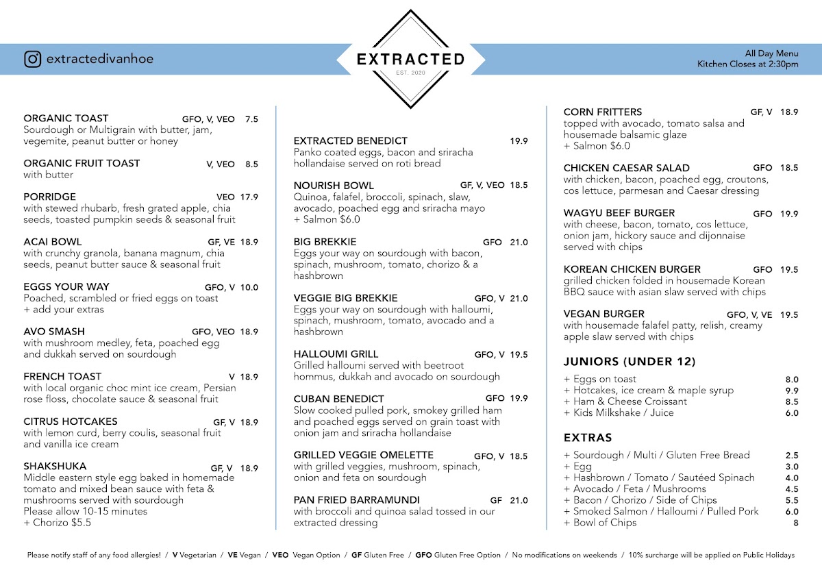 Welcome to Extracted, a vibrant café located at 215 Upper Heidelberg Rd, Ivanhoe! This charming spot boasts a spacious atmosphere with ample indoor and outdoor seating, making it perfect for your next brunch outing.