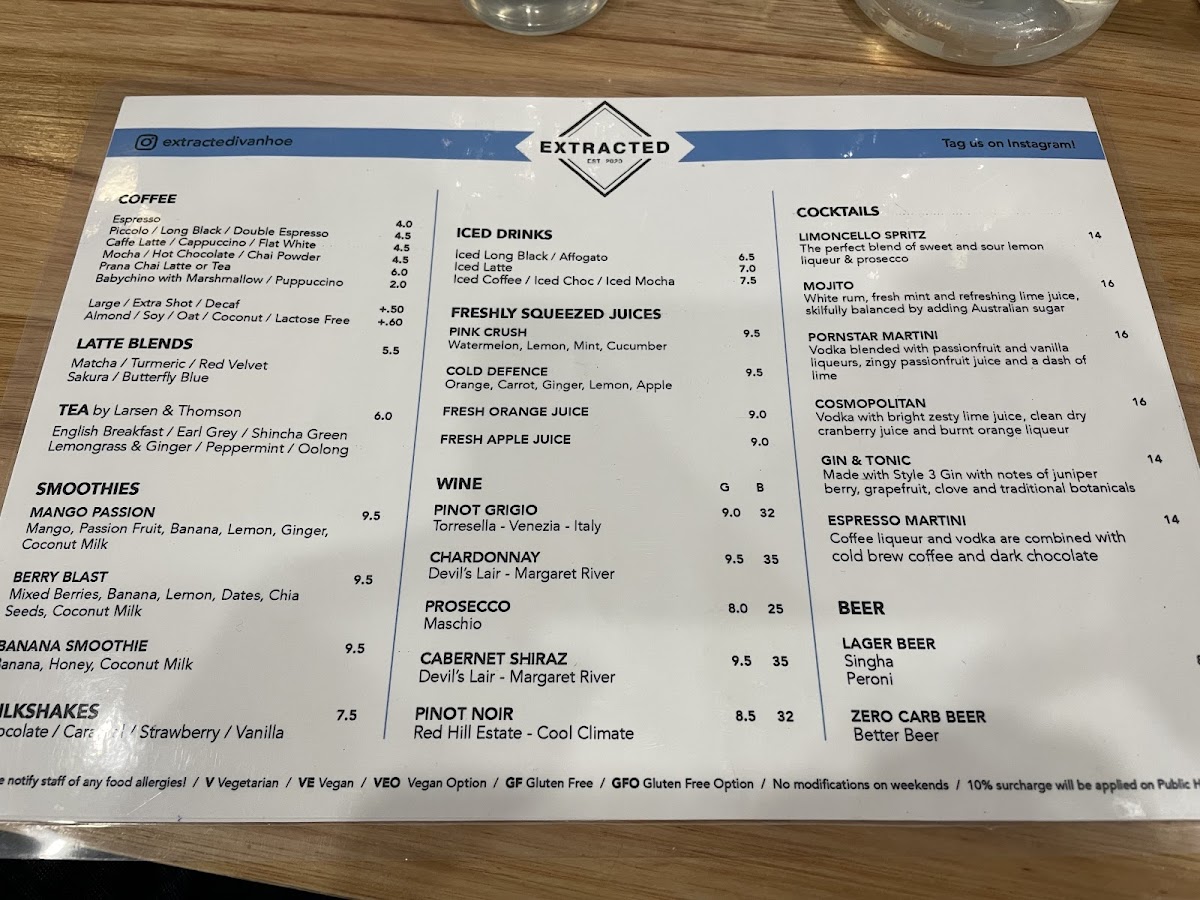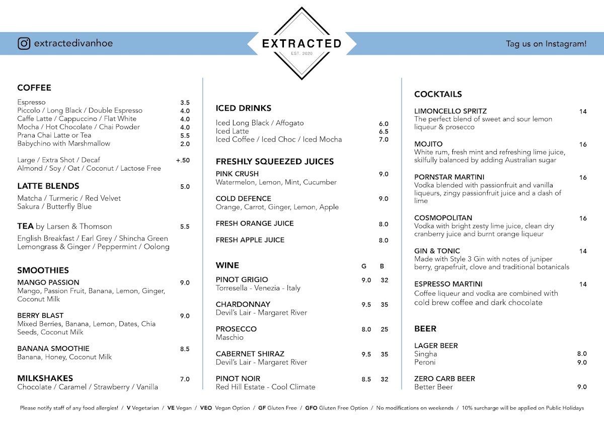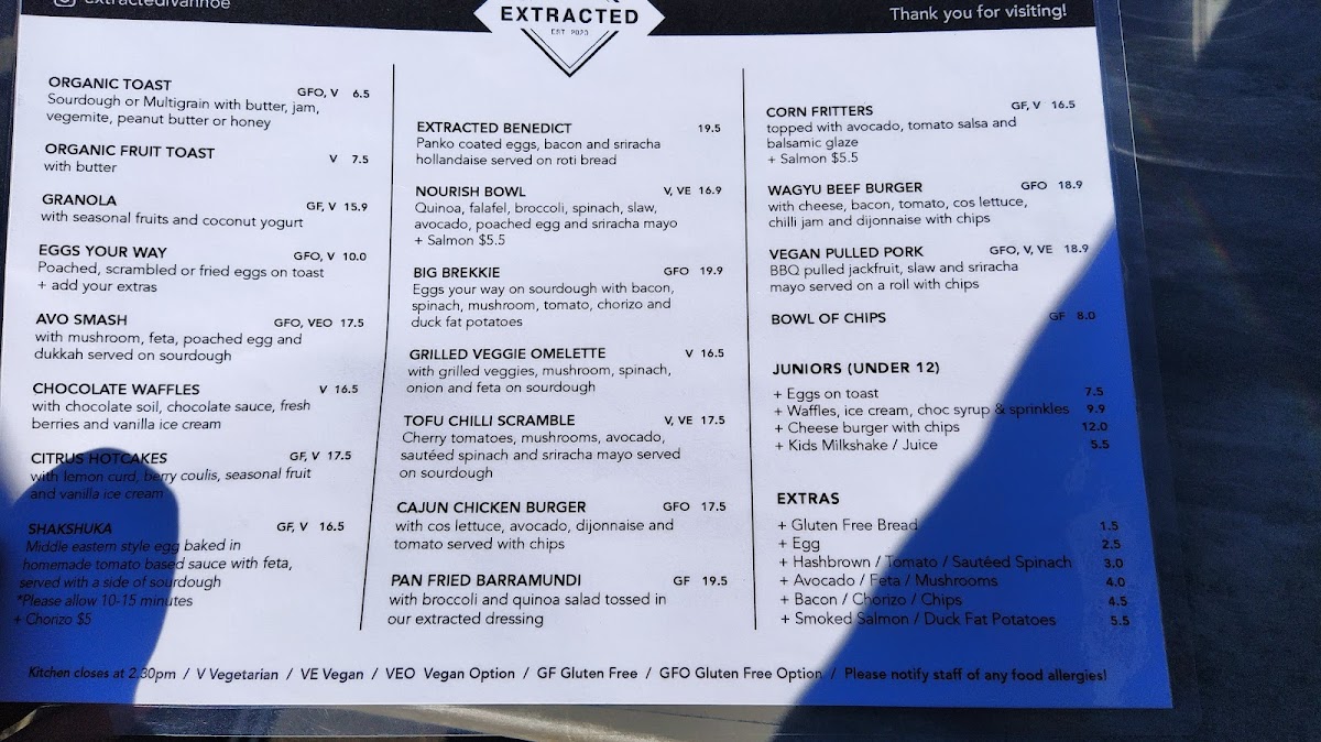 Extracted's menu is a delightful medley of options that caters to various tastes. Start your day with their acclaimed Acai bowl, the Cuban Benedict, or indulge in the soft, healthy corn fritters. Their beverage selection is equally impressive, featuring freshly squeezed juices like Pink Crush and Fresh Orange Juice, alongside an array of fine wines including Pinot Grigio and Chardonnay.